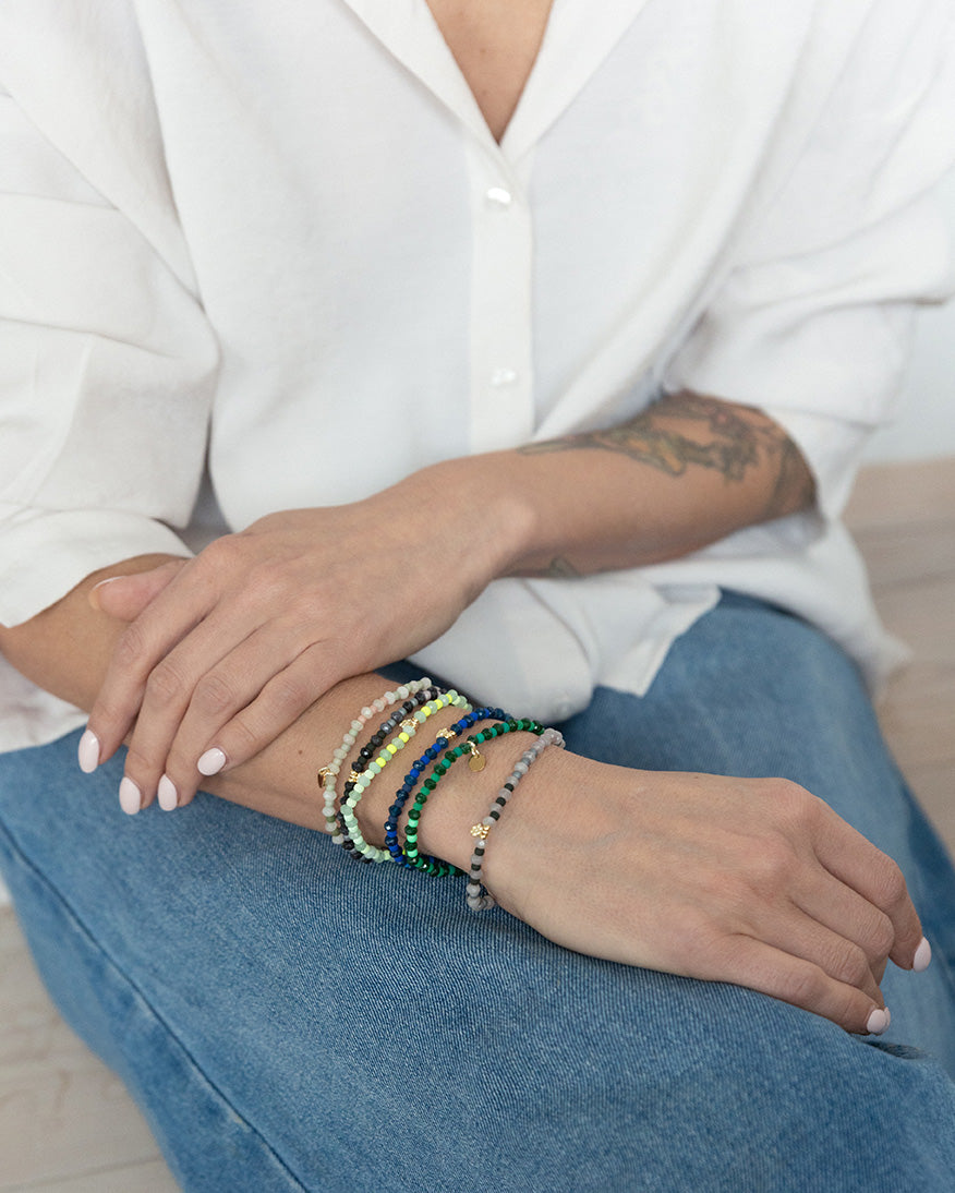 Das Super Gem Armand besteht aus Achat Edelsteinen in Linsenform kombiniert mit 3mm Glasrocailles in einem strahlenden Verlauf, mit vergoldetem Blümchenanhänger als kleines Highlight.